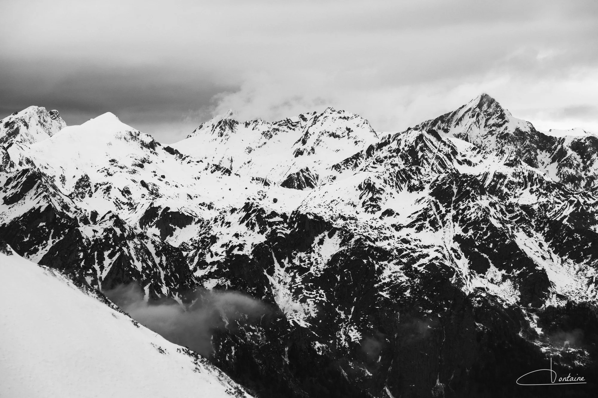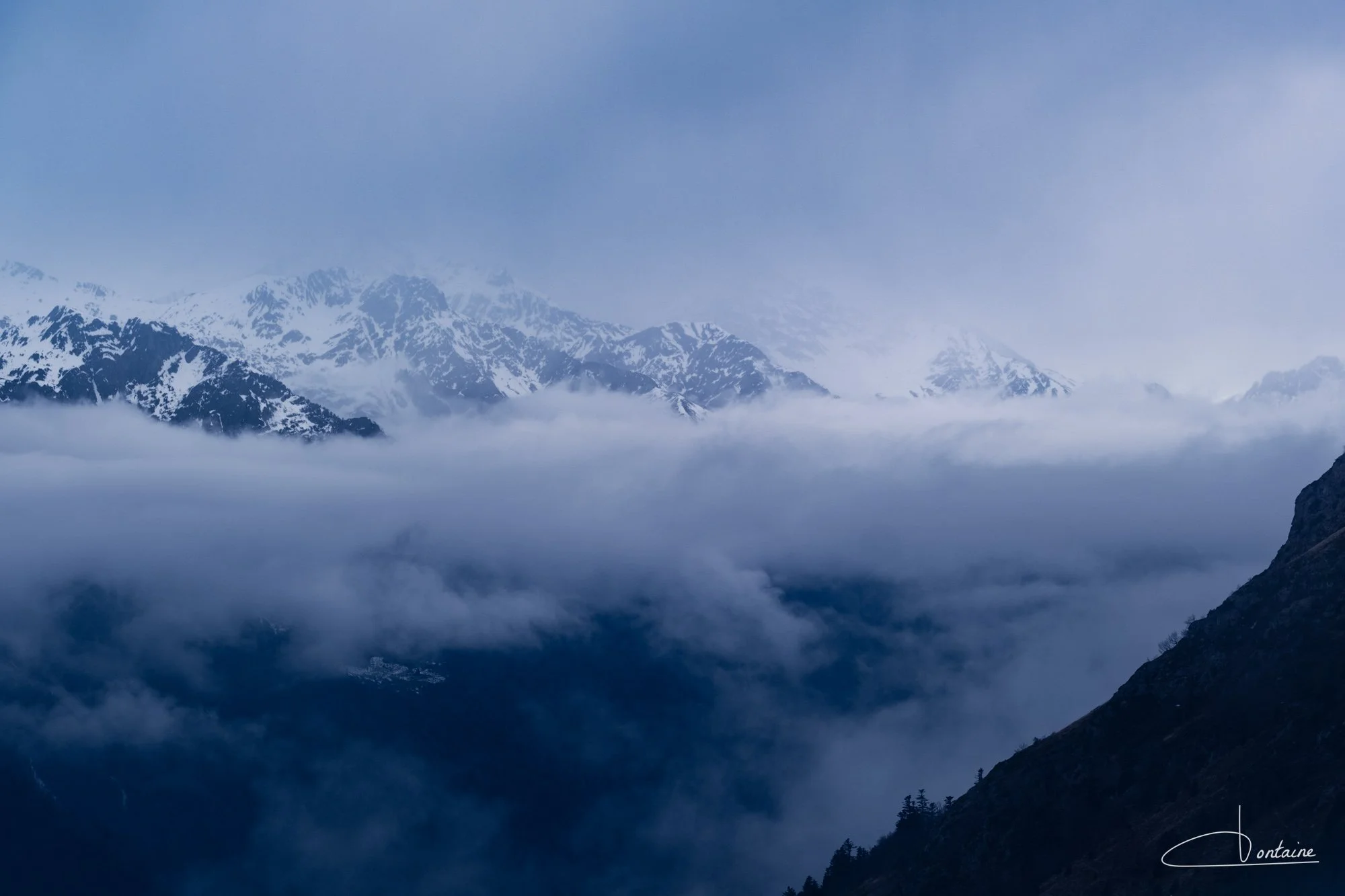 J’adore cette ambiance, où l’on ne distingue plus très bien le paysage du ciel. Il faut alors deviner les crêtes et sommets.