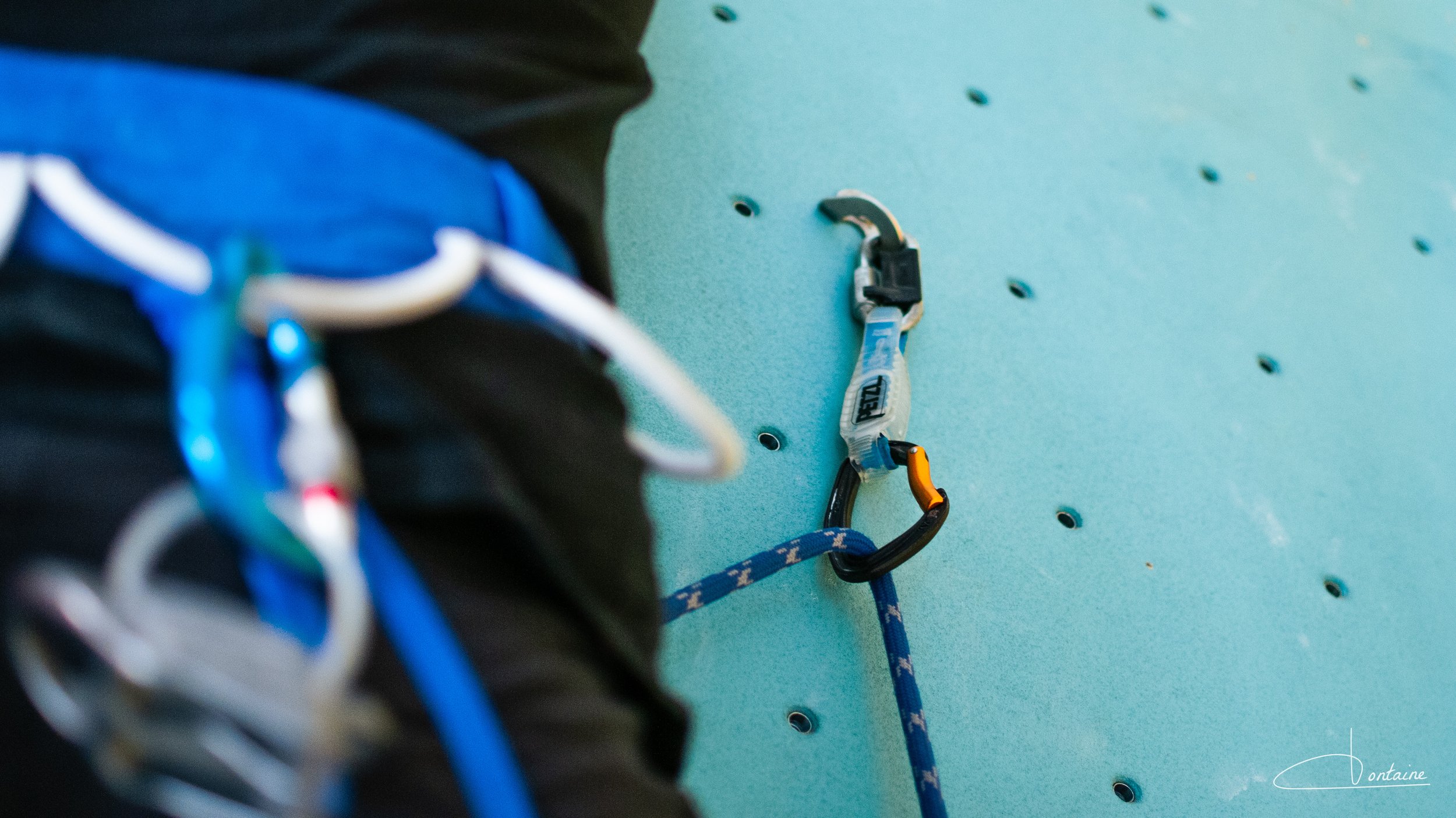 En bas du mur, ce sont des partenaires de grimpe qui se préparent à aller toucher la dernière prise, vissée tout en haut. Chacun dans son baudrier, cette chose qui vient vous prendre à la taille et aux cuisses par-dessus le pantalon, vous assurant la vie en cas de chute, mais aussi vous permettant d’accrocher plein de gadgets comme des mousquetons, une poche à magnésie ou encore des dégaines.