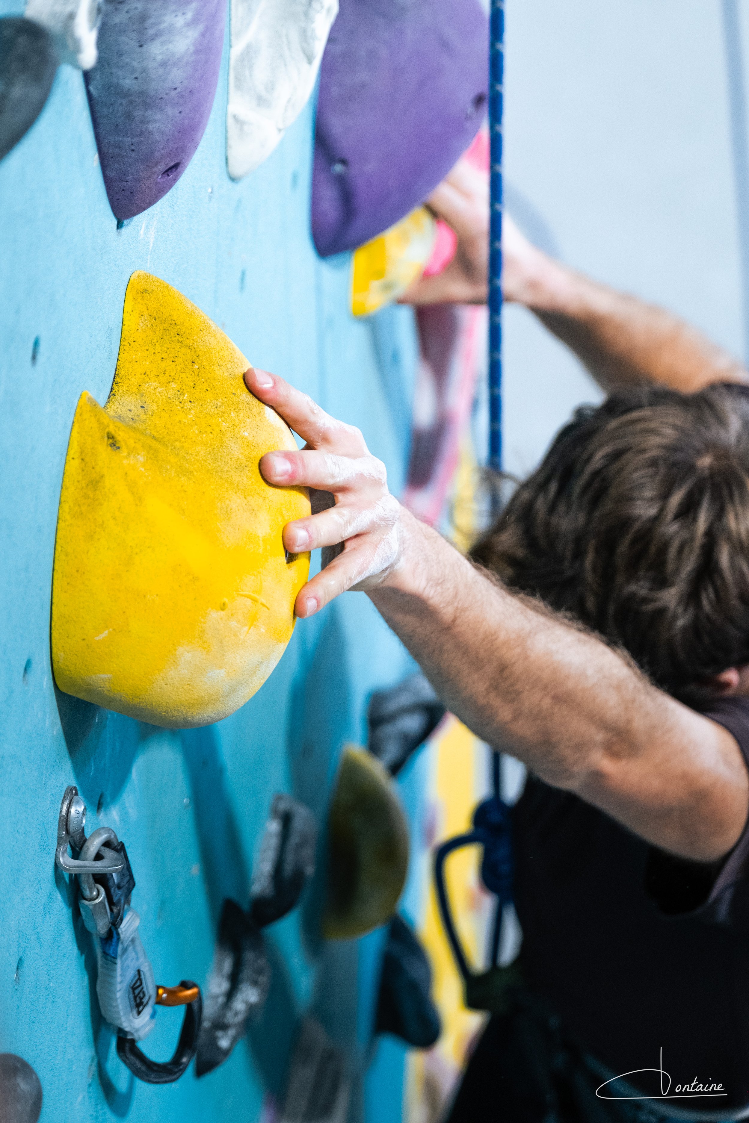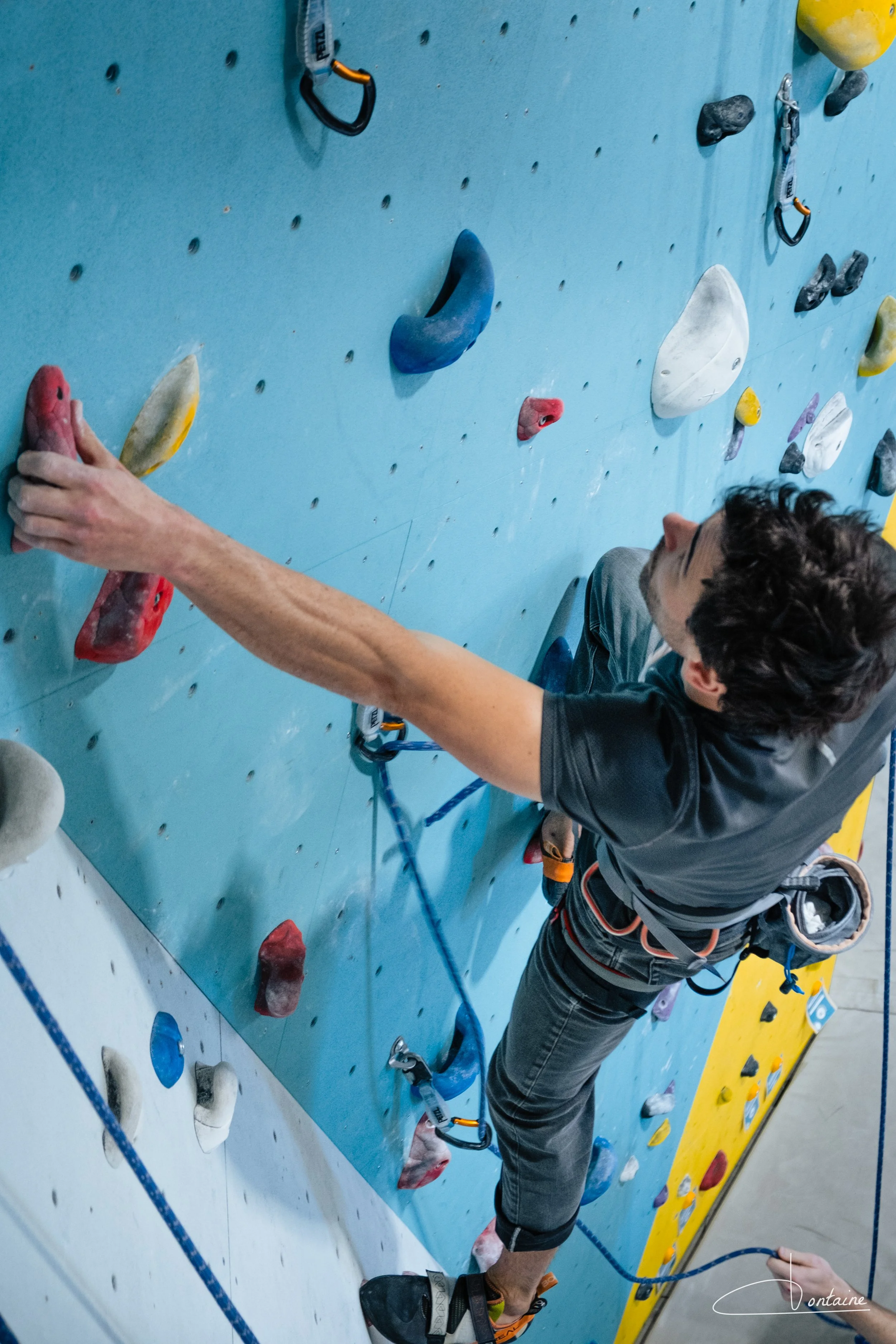 C’est avec une confiance en soi, en la personne qui nous assure, en son matériel, que l’on grimpe le plus haut possible. Après avoir varié les plaisirs : une faille, un toit, une traversée… le terme « Sec ! » retentit dans la salle, signe pour celui qui assure de bien retenir la corde et de nous faire par la suite descendre.