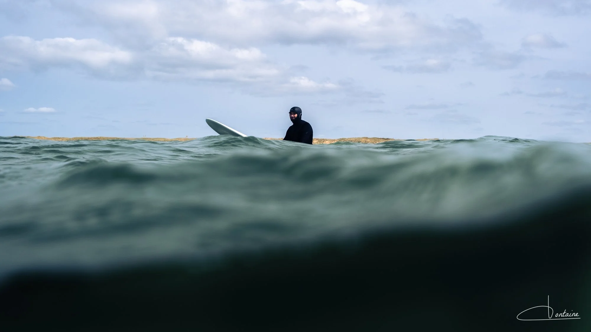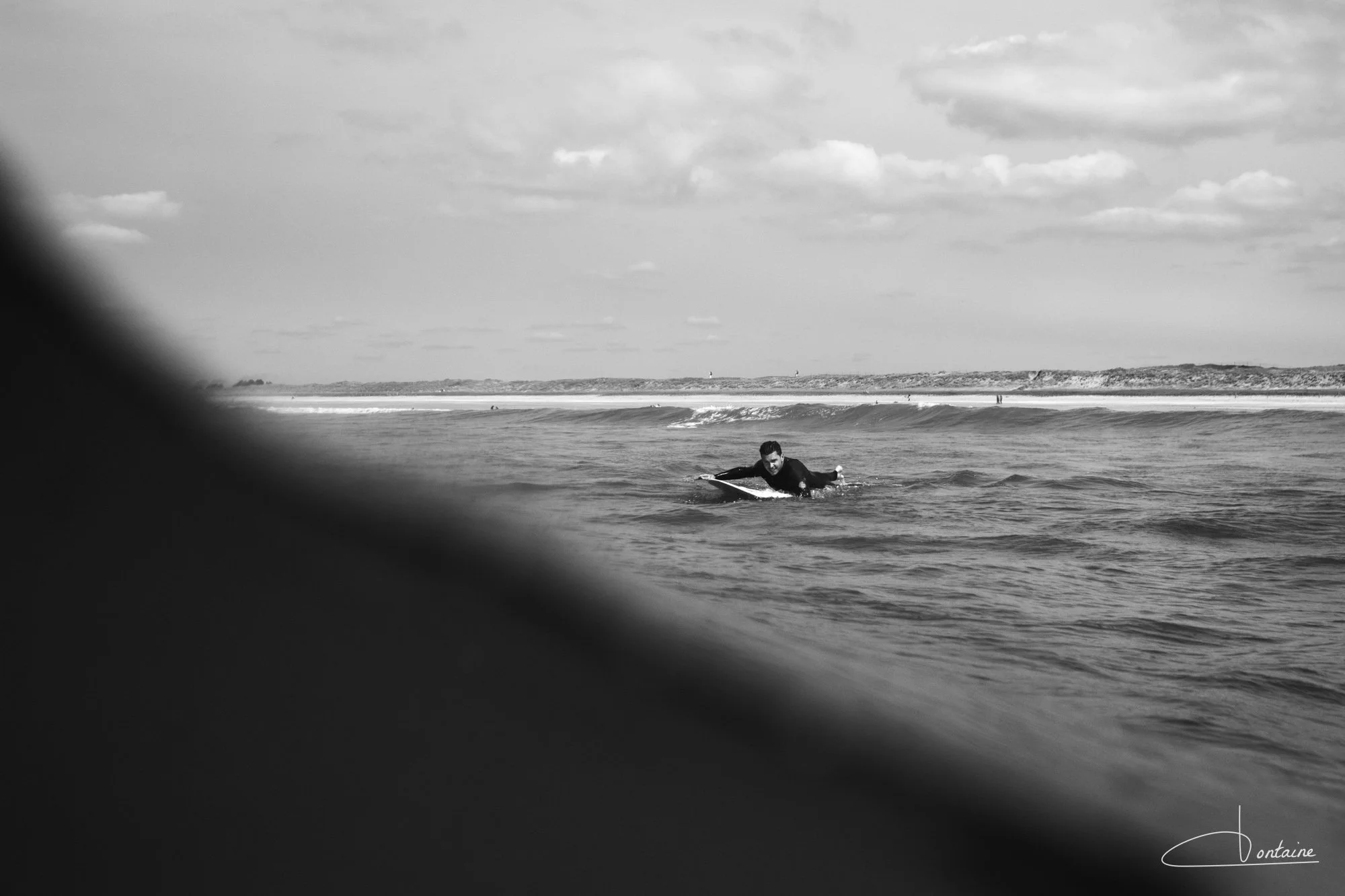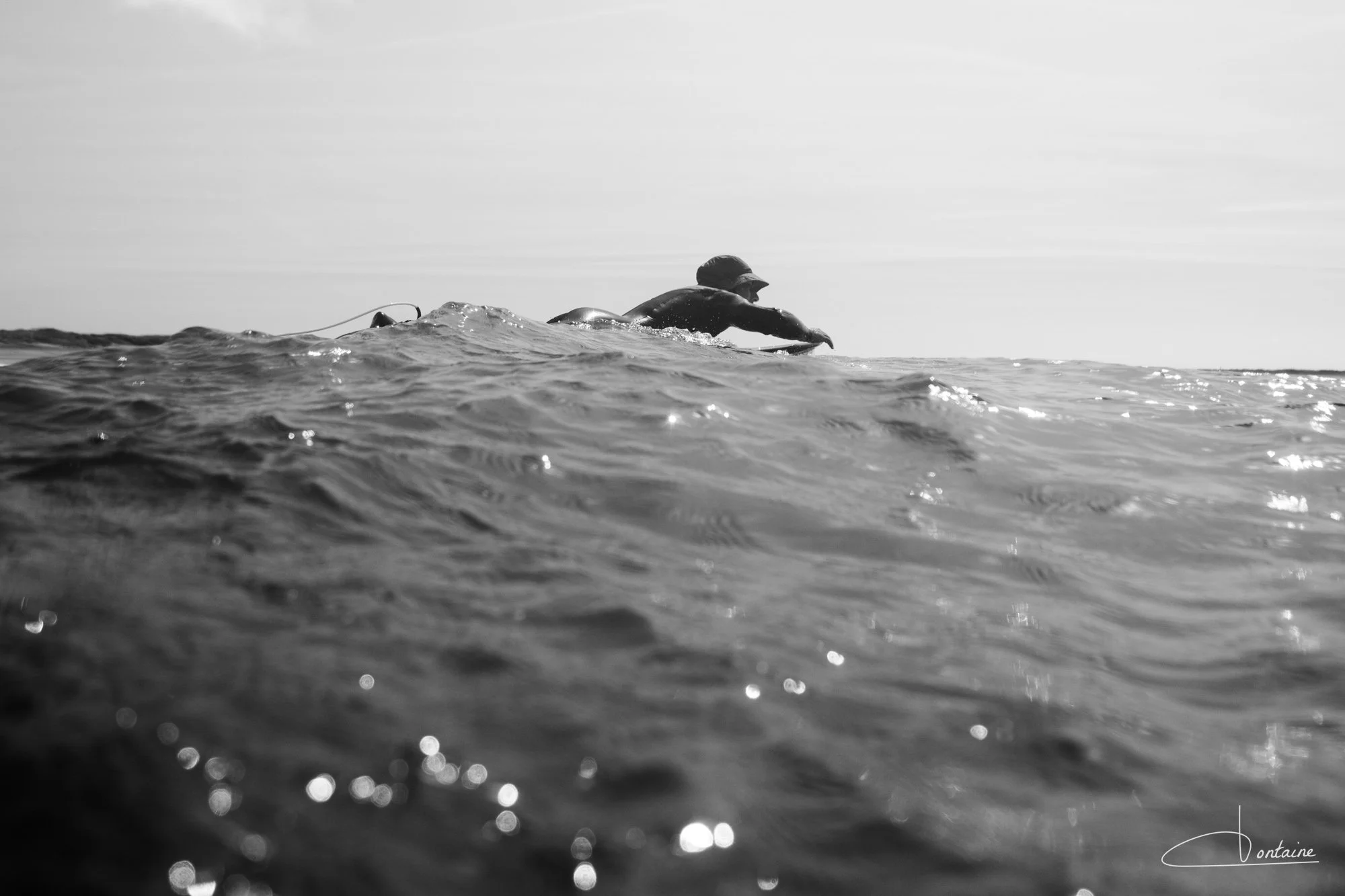 Équipé d’une combinaison en néoprène, d’une cagoule et de palmes de bodyboard, je rejoins les planchistes au large. Les palmes sont précieuses : elles me permettent d’avancer (presque) vite et surtout de ne pas m’épuiser trop rapidement. À vrai dire, je me demande souvent qui brûle le plus de calories : le surfeur sur sa planche ou le photographe dans l’eau. Une séance photo en mer, c’est du sport.