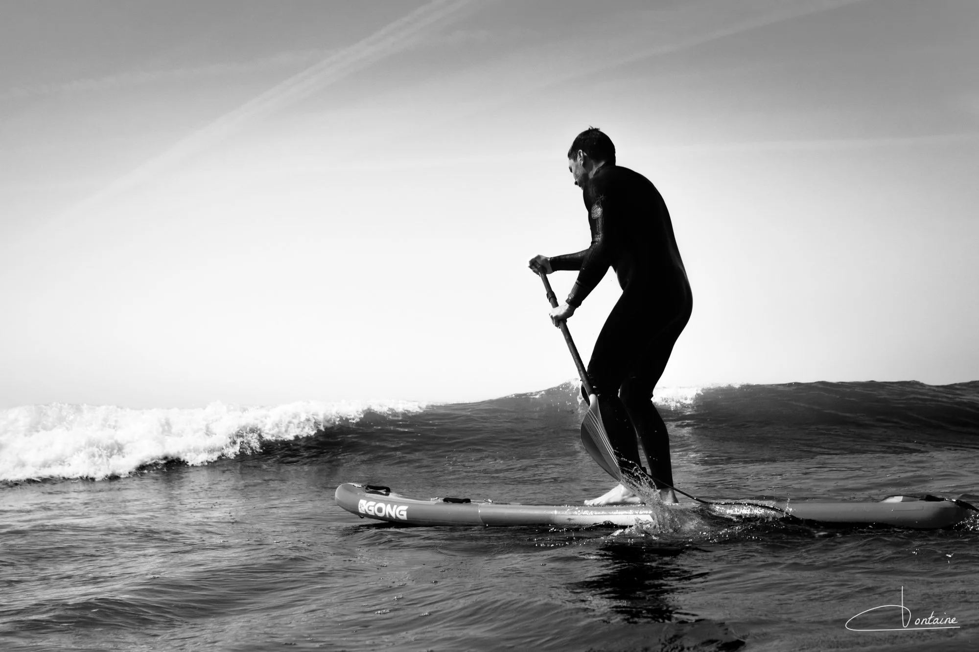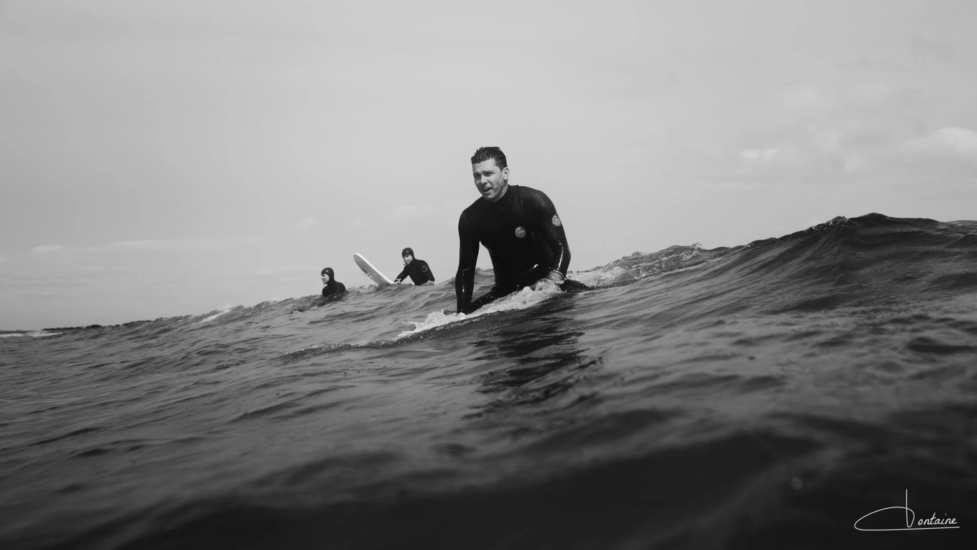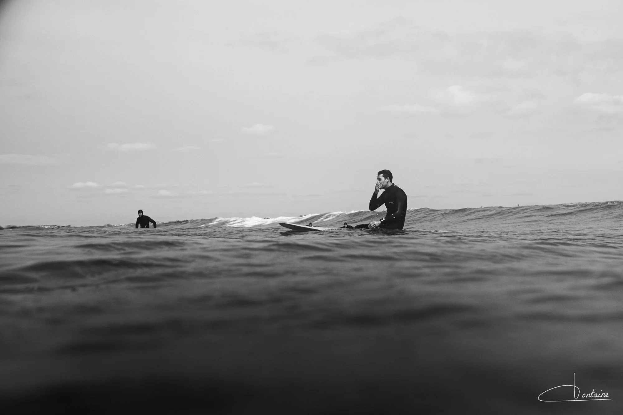 Équipé d’une combinaison en néoprène, d’une cagoule et de palmes de bodyboard, je rejoins les planchistes au large. Les palmes sont précieuses : elles me permettent d’avancer (presque) vite et surtout de ne pas m’épuiser trop rapidement. À vrai dire, je me demande souvent qui brûle le plus de calories : le surfeur sur sa planche ou le photographe dans l’eau. Une séance photo en mer, c’est du sport.
