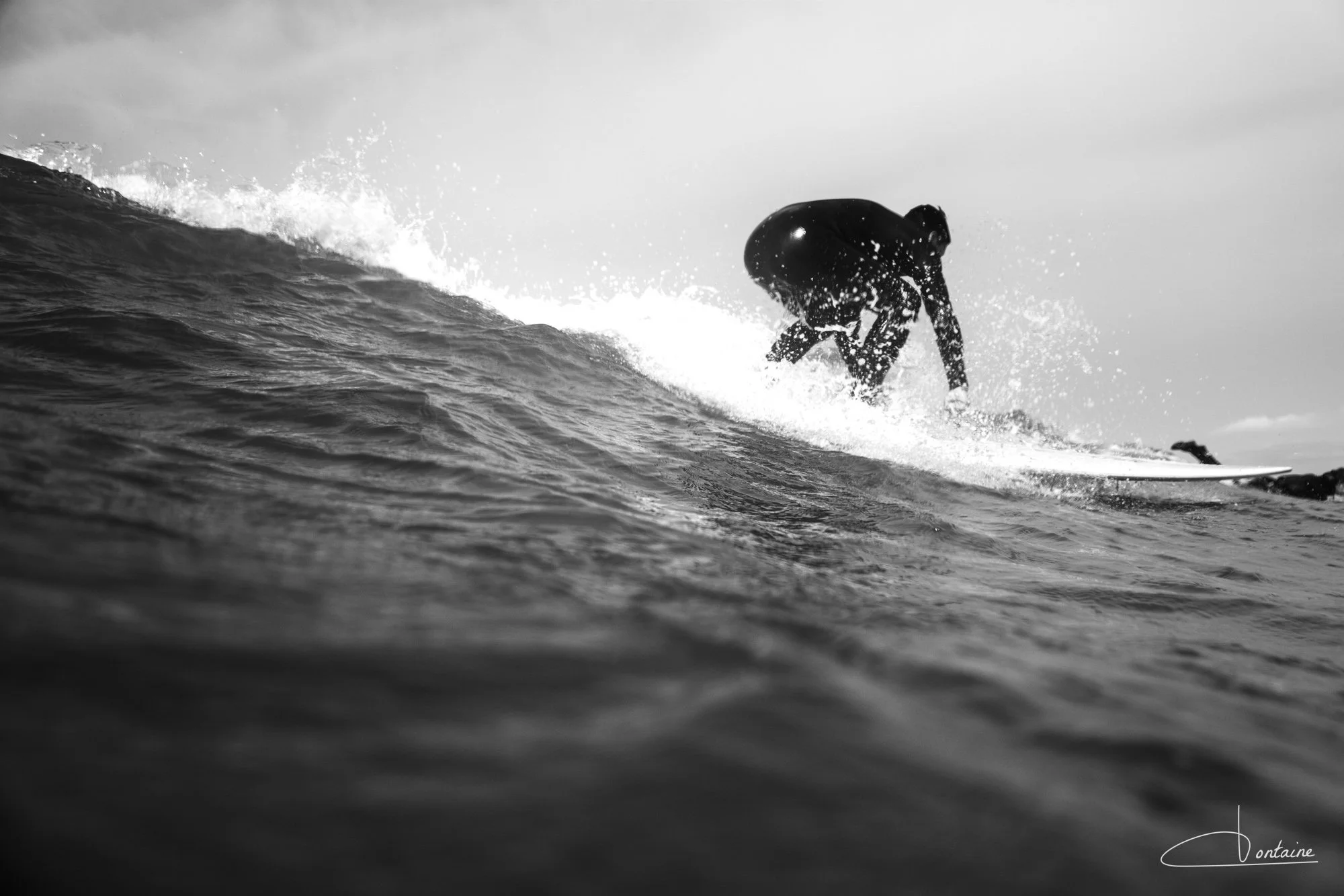 Les images réalisées dans l’eau sont radicalement différentes. La proximité avec le sujet ouvre des perspectives uniques. Les vagues nous élèvent, nous plongent, dissimulent puis révèlent le surfeur au fil de leur mouvement.